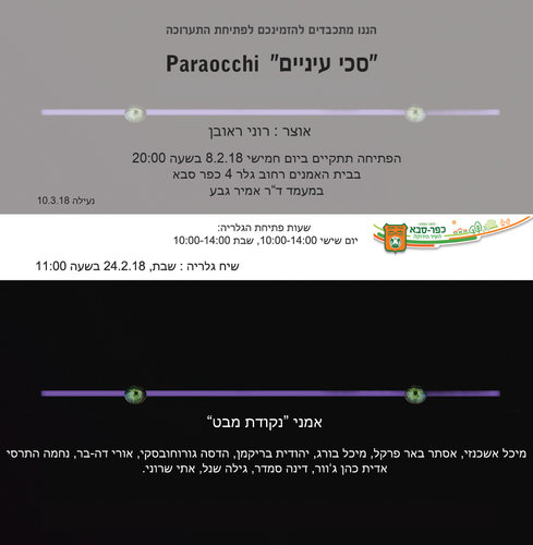 Paraocchi /08/02/2018 to - 10/03/2018 Translated using Google translate. location - בית האמנים , כפר סבא, רחוב גלר 4 Time - 08/02/2018 to - 10/03/2018 Exhibition opening - 08/02/2018, שעה - 20:00 פתיחה חגיגית ב 8.2.18 בשעה 20.00 בבית האמנים כפר סבא, במעמד דר אמיר גבע.