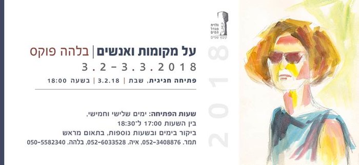 Bilha Fuchs - People, places / Kibbutz Shefayim Art Gallery03/02/2018 to - 03/03/2018 Translated using Google translate. location - Kibbutz Shefayim Art Gallery מגדל המים , קבוץ שפיים Time - 03/02/2018 to - 03/03/2018 Exhibition opening - 03/02/2018, שעה - 18:00 ארוע הפתיחה ייערך יום שבת ה 3.2 שעה 1800 אחהצ בגלרייה |