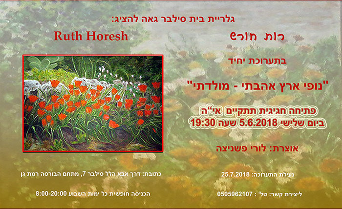 Landscapes of My loving Country - Ruth Horesh Solo exhibition / Silver House Gallery30/05/2018 to - 25/07/2018 Translated using Google translate. location - Silver House Gallery דרך אבא הלל סילבר 7, מתחם הבורסה, רמת גן. הכניסה חופשית בכל ימות השבוע. Time - 30/05/2018 to - 25/07/2018 Exhibition opening - 05/06/2018, שעה - 19:30 הרמת כוסית בלובי בנין בית סילבר רחוב אבא הלל 7 רמת גן, מתחם הבורסה. הציבור מוזמן! |