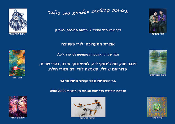 Group exhibition at Silver House Gallery curator: Lori Pszenica / Silver House gallery13/08/2018 to - 14/10/2018 Translated using Google translate. location - Silver House gallery דרך אבא הלל סילבר 7, מתחם הבורסה, רמת גן Time - 13/08/2018 to - 14/10/2018 Exhibition opening - 13/08/2018 |