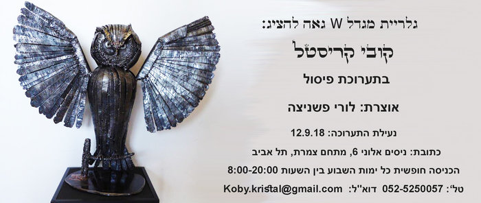 Kobi Kristal in Sculpture Exhibition Curator: Lori Pszenica / W Tower Gallery01/08/2018 to - 12/09/2018 Translated using Google translate. location - W Tower Gallery ניסים אלוני 6, מתחם צמרת, תל אביב. הכניסה חופשית כל ימות השבוע בין השעות 8:00-20:00 Time - 01/08/2018 to - 12/09/2018 Exhibition opening - 01/08/2018 |