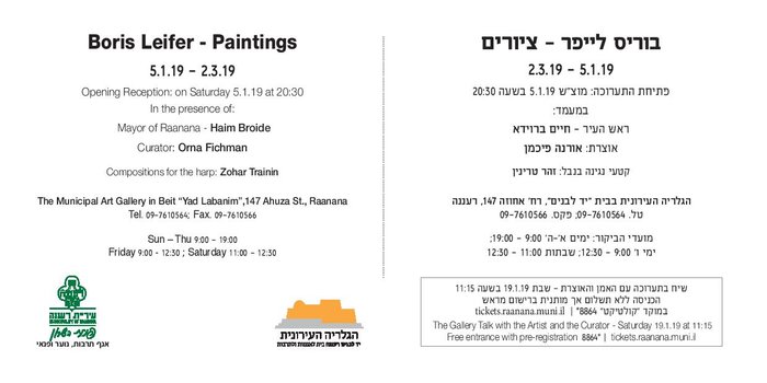 Boris leifer - Paintings /05/01/2019 to - 02/03/2019 Curator: Orna Fichman Boris Leifer was born in Ukraine in 1946. From 1969 to 1975 he studied at the Academy of Fine Arts in St. Petersburg. Petersburg, which has a connection to the traditional-European painting. He also worked as a stage painter in the Russian theater. Studies in the Academy of Art together with the design of the theater explain his tendency as an artist to create in his works compositions "staged" In his solo exhibition, which opens in January, the Raanana Municipal Gallery will exhibit its own portraits, portraits of young and old people, still lifes and open landscapes. In these three types of art there are motifs attached to life and death. In his portraits, Leifer attempts to preserve what can not be preserved - the elusive essence that constitutes human life, while at the same time a desperate gesture to recognize the end of life. These portraits are thus one of the artist's challenging ways to perpetuate the essence of that external and internal person, while at the same time challenging the passage of time. The paintings of still life reflect the reality of everyday human existence: various vegetables, fruit baskets, mini dishes and kitchen utensils. The painting of these points to a high skill in their textural description, as well as an emphasis on the lighting that falls on them - to which the artist attaches great importance. The observer of such paintings of Leifer takes a close-up approach, a view that creates a sense of intimacy with the objects described. In a number of works, Leifer depicts monochrome colors in white tones, elegant utensils and hospitality, with eggs laid on their sides. The choice of white monochromatic intensifies the short lifespan and fade of these as "fade out". Leifer's open landscapes also hint at the motifs of life and death: a lone tree in the landscape of the Dead Sea as a metaphor of life and growth despite the salty land of the "sea of death" and a desolate, desolate desert landscape with a donkey - a reference to the coming of the Messiah and the resurrection of the dead; To the three religions. Among these contrasting types in the art of Boris Leifer - the human being who is alive, moving, mobile and temporary versus the object / object, the immobile and the stationary takes place some sort of process of change in which the object / object is "awakened to life". Boris Leifer immigrated to Israel in the 1990s and lives in Ra'anana with his wife Nina. He dedicates all his life to painting and thus intends to continue until his death. Dates of the visit: Sunday - Thursday 9:00 - 19:00; Friday 9:00 - 12:30; Saturdays 11:00 - 12:30 location - אחוזה 147, רעננה Time - 05/01/2019 to - 02/03/2019 Exhibition opening - 05/01/2019, שעה - 20:30 במעמד ראש העיר |