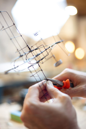 Connecting Lines / Center Gallery17/01/2019 to - 01/03/2019 Kobi Siboni - sculptures from metal wire Treasures - Lee Quinter and Their Rise The exhibition "Line to Line" is the opening exhibition of the series "Yesh Mish" in the "Gallery in the Center". We will present the works of Kobi Siboni, the artist of the sculptor in a metal thread combined with recycled materials. Today's world is characterized by increased production. There is a lot of waste that can be recycled or eliminated, and we are You need to find creative solutions to all the items that surround us that have lost use. In this exhibition we will unveil Hod Hasharon, a green city that has regrets its promotion of ecological values The artistic community in it, the design recycles. Kobi Siboni is a graduate of Bezalel Academy of Art and Design in Israel. His works use familiar symbols from daily life, which are transformed into a kind of drawing - Mainly done with iron wire. The first time Kobi had created this medium was still in elementary school. His father brought a copper coil with him, And Kobi played with string and created exciting figures. Over the years, he gained experience and inspiration and began to create sculptures of 1 mm thick. Today he continues to sculpt from the iron wire and even combines in his works scraps and debris that he collects in his wandering. Kobi creates these sculptures by bending and twisting the iron wire and plastic parts into sculptures filled with humor and creativity. His works move on the continuum between design and art, there are objects with a clear function alongside objects of a decorative-artistic nature. We invite you to enter the world of Kobi, where Kou meets a line and becomes a masterpiece of the whole world. In the exhibition there is a blurring between 2D and 3D, in an attempt to bring Kobi's design world closer to the viewer. The walls of the gallery were covered with line drawings combined with Kobi's three and two-dimensional works. The 3D objects echo the simplicity of the sketch line that describes the room.
