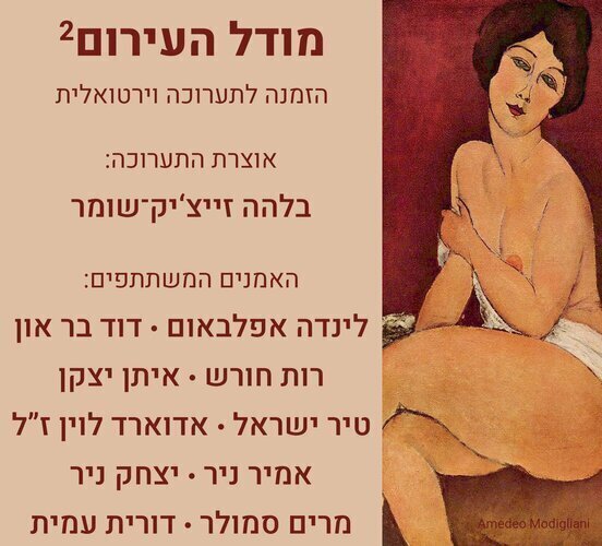 Translated using Google translate.Curator of the exhibition: Bilha Zajcik-Shumer. Participating artists: Linda Applebaum, Dr. David Bar-On, Ruth Horesh, Eitan Yitzkan, Tir Israel, the late Edward Levin, Amir Nir, Yitzhak Nir, Miriam Smaller, Dorit Amit To view the exhibition, click on the link (we recommend watching the exhibition via computer): https://www.artsteps.com/view/5ff3da0a4304392cebc895f9 Nudity played a major role in the history of art, from ancient Greece to the Renaissance. The great artists used it to describe ideals of energy, joy of life and inspiration, and on the other hand romantic, intimate and erotic feelings. location - התערוכה מוצגת אונליין Time - 10/01/2021 to - 31/12/2021 Exhibition opening - 10/01/2021 Link - https://www.artsteps.com/view/5ff3da0a4304392cebc895f9 |