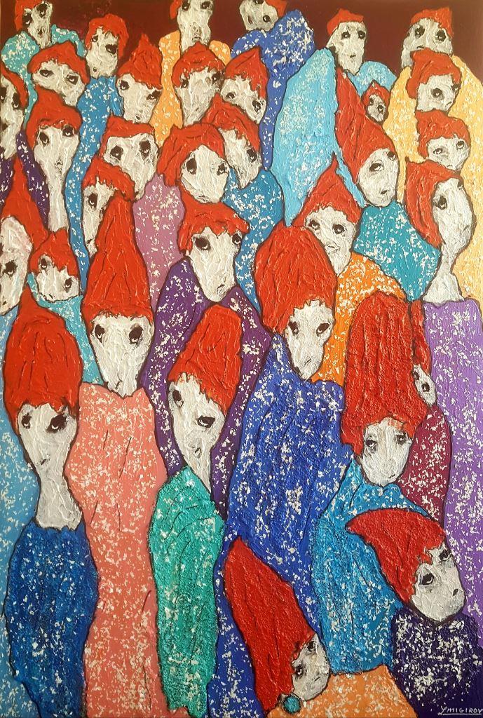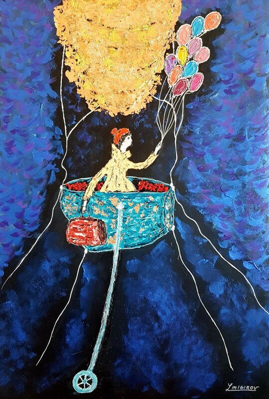 Lost Love Stations / Blue bird gallery21/01/2021 to - 28/02/2021 Lost Love Stations - Solo exhibition for artist Lela Migirov The Blue Bird Gallery Curator: Sara Raz, Chair of the Petah Tikva Artists' Association The exhibition will take place at the gallery in January-February 20201 Among the many rights an artist receives as a gift to a god is the ability to transfer spiritual thinking to a tangible exhibit. It is not difficult to accompany Lela in her works and experience her feelings. In the mask of the life of each and every one are interwoven loves. Some of the loves are realized and longevity and some dissipate and disappear. Loves that are interrupted due to parting or is success where are they stored? Is there a place where we can meet them again. Indeed every passion, every pain, every photo album of love, rises and floats with sounds and melodies of music, with smells and tastes, with laughter and tears reminiscent of stormy romantic moments. Love is not erased, it reappears at all times: as a memory we meet it in events, in encounters with people. With every look at sunrise and sunset, with gusts of wind, with star gazing and a cloud float in the sky. In the moonlight and darkness of the night, in moments of sadness and silence or a captivating smile. Looking at beauty and ugliness. Every spark of gemstone, every sight of water flowing up and reminiscent of remnants of love. The artist Lela Migirov in her talent and ability to express herself manages to guide us and tell us where all the lost old loves are stored. In the foyer of the exhibition we can look at an ancient mirror and see our figure reflected and from here we share the artist's feelings that evoke experiences and an understanding of her reflection. In her works Lela conveys the sense of journey, of dynamism and movement on wheels. From a high-rise tower studded with gems, to a glamorous carriage in bright colors laden with figures. From there we can see a boat sailing with the power of the oars that propel it in joint efforts. In a balloon, on a lighthouse rising over waves, in a friends' discourse, in caring for basic needs and in places of many gatherings, in any such place we can find those stations that contain the remnants of our loves. As the second thread between the works we can notice the scales leading to the experience, and the thick threads and ropes that ground the experiences into reality. Lela uses various techniques and materials such as gems, newspaper clippings and threads that are an addition to the color she puts on the canvas. The intense colors excite our senses. Love song excerpts add to the storm of the senses and give another mood to the intensifying experience. The artist's website: