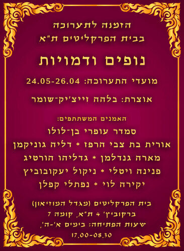 Landscapes and Figures /26/04/2021 to - 24/05/2021 Group exhibition at the Advocates' House (Museum Tower) Tel Aviv "Landscapes and Figures" Curator: Bilha Zajcik-Shumer Curator of the Museum Tower: Hagit Argaman Exhibition dates: 24.05-26.04 Participating artists: Smadar Ofri Ben Lulu * Orit Bat Zvi Harpaz * Dalia Gonikman * Mara Gandelman * Gedaliah Hortig * Pnina Vitali * Nicole Jakubowicz * Yakira Levy * Naftali Kaplan The Attorneys' House (Museum Tower), Berkowitz, 4 Tel Aviv, 7th floor. Opening hours: Sunday-Thursday, 08.30-17.00