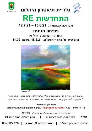 Translated using Google translate.Group exhibition In painting, photography, digital drawing, writing and patchwork Curator of the exhibition: Rachel Ziv The "RE Renewal" exhibition brings a creative and personal handwriting, with each participant bringing in his or her own themes, which express natural and human landscapes. The works abound in free and liberated depictions, drawn from sources and traditions from the world of art for generations, with uniqueness and independent artistic power. A language of bright colors and a restless creative temperament, a language of emotional and bold impression. It is a language that is re-created each time: it is the language of art. The works on display are in a variety of different and surprising materials, also combined with logical thinking, imagination and fantasy. This is a personal exhibition for each of the participants, where the human and emotional connection is the heart. An exhibition that brings the artistic expressions from Israeli life and culture. This is a representative selection on topics, which are a personal identity card. Participating artists: Aviva Bitton Orna Kelly | Ilana Sagi Ella Ostrovsky Esti Glazer Esther Kahana Gali Glickman | Dalia Gonikman Sandy Sun | Shlomit Berkowitz Height Peter's Bags. location - רח' היצירה 3, רמת גן Time - 15/06/2021 to - 12/07/2021 Exhibition opening - 18/06/2021, שעה - 11:00 |