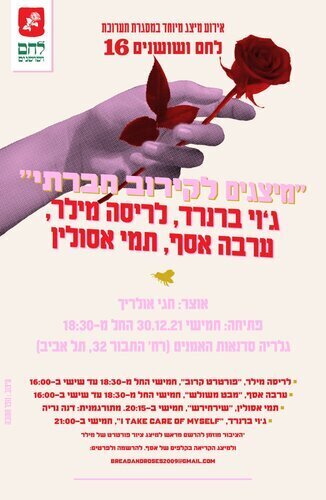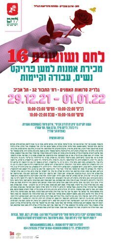 16th annual Bread and Roses / Tel Aviv's Artists' studio29/12/2021 to - 01/01/2022 The Cindianat Hagalil and Ma'an Association of Workers holds an annual exhibition of works of art every year, the proceeds of which are dedicated to projects that promote and encourage the integration of Arab women in the labor market. In the exhibition, which will take place this year between December 29 and January 1, 2015, at the artists' workshops in Tel Aviv, the works of over 400 artists will be displayed for sale. Among the hundreds of artists, Jews and Arabs, who contributed their works to the sale, some prominent names, including: Yair Garbuz, Michal Ne'eman, David Adika, Tzivi Geva, Aisha Arar, Durar Bakri and many more. This year there will also be a "Exhibitions for Social Introduction", a special exhibition event featuring four artists: Joy Bernard, Larissa Miller, Arava Assaf and Tami Assulin (curator: Hagai Ulrich) .