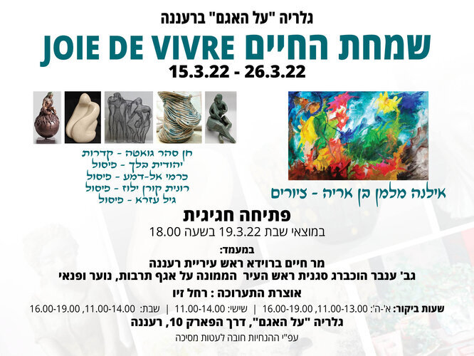 JOIE DE VIVRE /13/03/2022 to - 26/03/2022 Ilana Melman Ben Aryeh The joy of life JOIE DE VIVRE Curator of the exhibition: Rachel Ziv A native of Tel Aviv, a resident of Herzliya, she studied at the Art College in Ramat Hasharon with Eliyahu Gat and Rachel Shavit, and at the Higher School of Painting (Kalisher). A graduate of Tel Aviv University. She studied at the Sorbonne, worked at Kol Yisrael, and taught for many years. Has been painting since a young age and has participated in many exhibitions in the country. Paints in an abstract and figurative style, in bright and warm colors, expressing emotional experiences and impressions from those around her, indulging in landscapes, the splendor of nature and the beauty of creation. Her paintings are a metaphor for our lives. The recurring painting themes in the works constitute a rich body of work that contains within it: trees, flowers, bird figures and nature as a whole. The first impression received in the eye of the beholder is the multicolor that illustrates the joy of life and optimism. The images that appear in pairs (diptych or triptych), emphasize and complement each other as welcome systems. The creative processes that occur and take place in the depths of the soul contain intense emotions, experiences, impulses and desires. All of these are seen as a dream, they are the creations of the imagination, as in the depths of the mind so also in the symbolism of processes. Ilana has exhibited in many exhibitions in Israel and around the world. Translated using Google translate. location - גלריה "על האגם" ברעננה דרך הפארק 10 רעננה Time - 13/03/2022 to - 26/03/2022 Exhibition opening - 19/03/2022, שעה - 18:00 |
