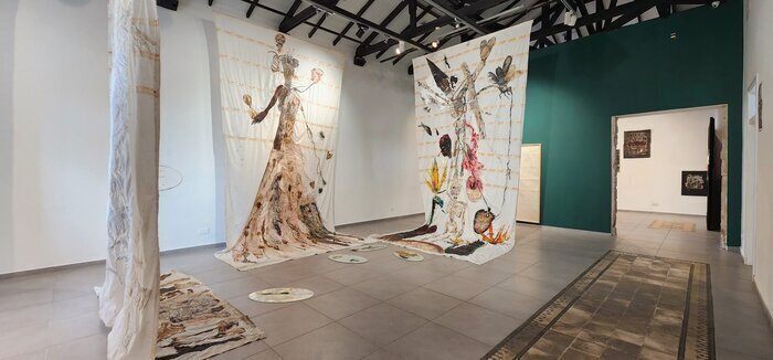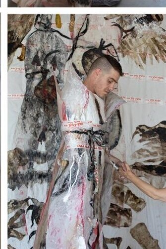 And then the silence / CCAטלפון - 03-5106111 02/12/2022 to - 28/02/2023 An installation comprised of three works on huge fabric sheets (each about 6 m high) form the core of the exhibition “And then the silence” by Ruthi Helbitz Cohen. The installation creates a capsule of space within a space; elliptical mirrors placed on the floor simultaneously reflect the artworks and the viewer. Curator Dr. Smadar Sheffi wrote about the work: “Ruthi Helbitz Cohen’s works focus on issues of femininity, gender, equality, and cultural structures of women’s images. Her figures are based on primordial sources - mythologies and stories – and on their various incarnations in art and popular culture, such as Walt Disney films. Helbitz Cohen’s intensive artworks narrate stories, nightmares, dreams, and legends – at times painfully. These images are seemingly vocal, as if reciting poetry, screaming, and murmuring utterances, acting as independent entities seeking their pathway through the world.” For the first time, Helbitz Cohen is exhibiting a staged photograph: Tomer Sapir, artist and friend, is seen in the photographs enveloped in a paper dress that is exhibited in the Hourglass, part of the installation. The dress, made of painted cutouts of body parts, is delicate yet terrifying. The paper dress encases Sapir like a cocoon encasing a chrysalis which becomes a butterfly. The interface between the male body and Helbitz Cohen’s paper dresses raises issues of gender and power.