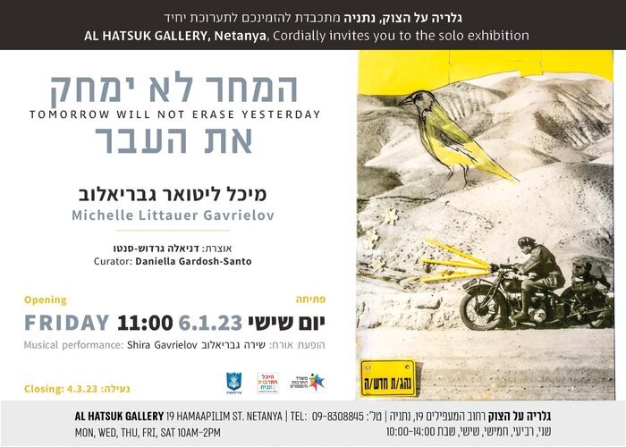 Tommorow Will Not Erase Yesterday / Al Hatzuk Gallery06/01/2023 to - 04/03/2023 d, places, worlds connects that journey artistic personal unique a is exhibition This love a and past the of memories between dialogue a beats which of heart the at, destinies .present the into continues that story photographs of collection rare a of discovery the is journey this of cornerstone The The. century 20th early the to back dating, grandfather beloved s'artist the by taken but, nostalgia and memories family personal only not sparked immortalized he sights connection a, gone long is that reality a to connection universal more and deeper a also a creating of promise the hold that pieces puzzle like enigmatic are path a outlines that .picture complete his and surroundings his, life his documented, Littauer Franz. Dr, grandfather scientist The his - Israel of Land the in life his to, birthplace his, Germany in youth his from, family the in, sea blue the along, eyes admiring his of front in right built being is that homeland .oranges and camels with bustling, city white the in and desert vast the in, sun burning them turns and her inspire that those selects Michelle, story wider a hide that photos From fragments from essence Israeli the reveal that photos, works art her of foundation the into also is which, past the for longing between connecting bridge a build and, memories of .present the and, memory collective our of part into life new breathe that, forms media diverse in photographs the with deals Michelle and ecological, social making while, vitality and humor, fantasy of symphony sensual- colorful a creates She. more and lighting, texts, collage, embroidery, painting, color: them and constant is collection the with dialogue The. time same the at statements cultural a of creation the to led discovered recently just were that clips film rare but, continuous ."art video "unique timeline the complement that works other and paintings includes also exhibition The especially, nature and man between relationship weakening the of process the echo and ,Israel of wildlife dwindling the perpetuates Michelle, mission of sense a With. animals and sensitivity special showing, landscape our from disappearing are that species animals those when, pandemic the During. expressions human their to tenderness began artist the, people of empty sudden a of all were which spaces public in emerged "hybrid "The. worlds different seemingly the between bonds hidden the investigating about thoughts raise, forms enigmatic in merge animal and man which in, paintings that recognition a as well as, them between hierarchy the and animalism and humanity .nature of fabric complex more and larger the of part only is, time of regardless, man .future the of fruits the and present the of flowers the grow that past the of thorns the is It Santo-Gardosh Daniela Curator location - Al Hatzuk Gallery המעפילים 19 נתניה Time - 06/01/2023 to - 04/03/2023 Exhibition opening - 06/01/2023, שעה - 11:00 בפתיחה יתקיים אירוע עם הופעה של שירה גבריאלוב שאף כתבה את המוזיקה לוידאו ארט Link - https://https://m.facebook.com/story.php?story_fbid=10162397746678082&id=729103081&mibextid=Nif5oz |