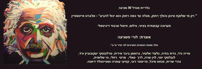 תערוכה קבוצתית: רק מי שלוקח סיכון והולך רחוק, מגלה עד כמה רחוק הוא יכול להגיע - אלברט איינשטיין / גלריית מגדל W19/11/2017 עד ה-30/12/2017 לורי פשניצה אוצרת התערוכה כאוצרת מגדל W אני מתכבדת להציג גלריית יצירות להנאתכם במבחר סגנונות אמן בפסיפס מרתק וססגוני עם מטאפורות וסמלים בטכניקות מעניינות ובעיבודים שונים. זה הזמן להתרשם מ- 15 יוצרים בתחומים ובסגנונות שונים שהתלכדו יחדיו בעיקר בשל אהבתם הרבה לאמנות. אלה שמות האמנים המשתתפים לפי סדר א'-ב': אריה ורד - מלאת אהבה לטבע ולאדם, רגישה לסביבתה, משתפת הווי חיים בציוריה הריאליסטים והאבסטרקטיים גם יחד. יצירות רבות שלה בנושא טבע ונופים. ציורי הפריחה בשדות - מרהיבים. האמנית מצליחה להטמיע את האופטימיות ביצירותיה. מוסיפה תמהיל חייכני מלא תשוקה ותקווה מבורכת. ורד חברה 24 שנים במקהלת "רון חולון" - ומופיעה בארועים רבים ברחבי הארץ ובעולם. גזית בתיה - אמנית רב תחומית. החלה לפסל בסוף שנות ה-90. יצירותיה משקפות את החיים כמראה. מביעות שמחה, עצב וגעגועים. בתיה מביעה במספר רב של עבודות את הכבוד שהיא רוחשת לנשים, מעצם היותן נשים. ההשראה מגיעה מרגעים מקריים, מחוויות, מצילומים, משפת גוף ועוד. הפיסול, הצביעה והשריפה בשילוב חומרים שונים יוצרים הפתעה בבריאת היצירה וזוהי חוויה שאין דומה לה. חוויה נוספת ומיוחדת מתקיימת בפגישות שוחרי אמנות בארועים שונים וכשיצירותיה מוצאות להן בית חם. גלעדי אלעזר - אלעזר גלעדי, צייר בן 34, נולד וגדל במושב עולש שבעמק חפר. הוא מצייר דרך התבוננות בתלת ממד ו"תרגומו" לדו ממד. בעיניו, הציור מהתבוננות הוא אומנם ציור של עצם/גוף "אובייקטיבי" - אולם, בתהליך היצירה, יש התמזגות של אותה מהות של האלמנטים המצוירים עם הרגש והלך הרוח של הצייר כאשר הוא מתבונן בהם - ניתן לומר שהצייר מצייר את עצמו, בין אם מדובר בכוס זכוכית או אדם היושב מולו כמודל. גרוסמן ביבר אירית - פסלת. ילידת הארץ , גרה ויוצרת בגבעתיים. חברה באיגוד הציירים והפסלים בעיר גבעתיים /רמת - גן. בוגרת בי"ס ללימודי הנדסאות ואדריכלות. חדוות היצירה עבורה היא הענקת רוגע ושלווה המנתקים אותה מחיי היום יום. ביצירותיה היא מביעה את שמחת החיים והחוויות שחווה בטיוליה בארץ ובעולם ובהיתקלותה בדמויות מסקרנות ומיוחדות, שנחרטו בזיכרונה. דרך הפיסול היא מנציחה את הרגע שבו קלטו עיניה את הדמות שסקרנה אותה ומשכה את תשומת ליבה. טרלובסקי יעקובוביץ ורד -החלה את דרכה האמנותית לפני 25 שנה בסטודיו לפיסול ברעננה. במהלך השנים נחשפה לחומרים שונים וטכניקות שונות והתמקדה בציור פיגורטיבי מופשט. בשנים האחרונות היא מתמקצעת בעיבוד צילום במחשב (Art Photo) . בעבודותיה פורצת אישיותה, ברעיון ייחודי המשולב ברגשות. ורד מתמקדת בעיקר בדמויות ובהתמזגותן במרחב, באמצעות אפקטים שונים, לפעמים דרמטיים ובעיקר משדרים את ה"שונות". האמנית השתתפה בתערוכות בארץ ובעולם. לובלסקי יוסי - בוגר ביה"ס לאדריכלות אונ' תל אביב. מצייר בטכניקות וסגנונות שונים. יצירותיו עוסקות בנוף הארץ ישראלי, בנושא משפחה - אבהות ואמהות, טבע חי ודומם. כמי שנולד בסביבה כפרית עם מרחבי טבע, הוא משתדל להביע את געגועיו דרך הטבע, עבודת האדמה, הריחות, הצבעים והחוויות שמסמלים כעוגן לאידיאליזציה של ארץ ישראל היפה והשורשית. בטכניקה ייחודית יצירת ה'סינקופה' שלו בתערוכה מתארת ביטוי לשינוי עתידי במסלול חייו של תינוק ביקום. לוין שרה - בת 43. נשואה, אם לשני בנים. מורה לארכיאולוגיה - בעלת תואר ראשון בארכיאולוגיה ותולדות האמנות ותואר שני בתולדות האמנות. כל ציוריה באקריליק על קנבס. לרך סאלי - פסלת. גרה במושב בית יהושע. לפני כ-20 שנה התוודעה לחימר ולמדה פיסול קרמי על אובניים. שנים עסקה ביצירת כלים לשימוש וגם לנוי. לפני כ-5 שנים עברה לפסל בחימר פיסול פיגורטיבי בסטודיו של הפסלת יהודית סודאי. כל יום עבורה הוא אתגר. כל הפסלים עברו יציקת ברונזה. מרטי רחלי - אומנית רב תחומית הגרה בכפר עין כרם העתיק שהירוק ,האבן הישנה ו