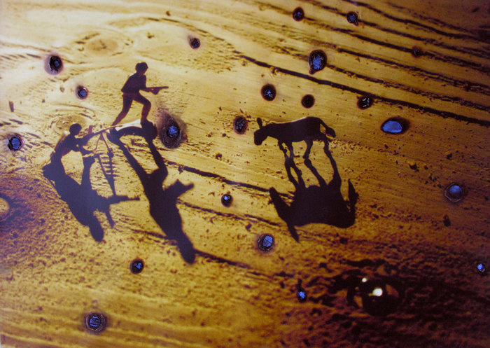 חיילים אבודים בדיונה אינסופית מרכיבים מיצב צילומי, המייצר תחושה של אובדן ותלישות, בתוך רצף של מלחמה אינסופית, הממשיל בין ילד פגיע השרוי באמבט לבין הצללית האוחזת ברובה. בין הצללים, צצים גם חמורים, פרות ועזים תועים, "לא מעורבים" הנקלעים לקו האש. הדימויים נעים בין ריאליזם לסימבוליזם ורבים מהם עושים שימוש בטקסטורה הייחודית של מרקם העץ, המזוהה עם עבודותיה של נשרי בעשורים האחרונים. העיסוק במרקם משמש את נשרי כחלק ממהלך של ריאליזם חומרי, שבו טקסטורות וחומרים טבעיים מוחלפים בחומר קונקרטי המזכיר אותם. כך, במקום לצלם או לצייר בשר, פצעים, פרווה ועור, היא משתמשת במרקם העץ המדמה אותם. העץ משמש בעבודות המופיעות בתערוכה כמצע מאחד ומחבר - כרקע בעל נוכחות, הנדמה לעתים למים ולעתים לדיונות חול, מהן צומחים חיילים ואליהן הם שבים. חרפושית מצרית מטפסת במעלה הדיונה לעבר החיילים מביאה איתה ניחוח של מזרח תיכון קדמון.