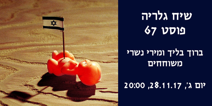 שיח גלריה בתערוכה שלי "פוסט 67" ביום הולדתי ה-67, שבמסגרתו אשוחח על עבודותיי עם ד"ר ברוך בליך, מרצה בכיר בבצלאל וחוקר אמנות. הערב יכלול גם הקרנת קטעים נבחרים מעבודות הווידאו שלי.