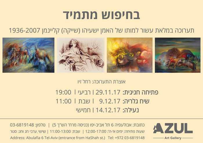 בחיפוש מתמיד / גלריה אסול29/11/2017 עד ה-09/12/2017 אנחנו מתכבדים להזמין אתכם לתערוכה מיוחדת ומרגשת - תערוכת "בחיפוש מתמיד" שתתקיים לרגל עשר שנים למותו של האמן ישעיהו (שייקה) קליינמן.