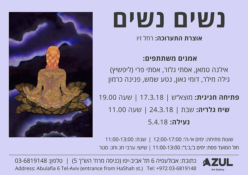 נשים נשים / גלריה אסול17/03/2018 עד ה-05/04/2018 "נשים נשים" תערוכה קבוצתית "נשים, נשים..." שר יוסי בנאי במערכון המשעשע שכתב והלחין: ליאו פרה בתרגומה של נעמי שמר. "חצי חיוך על כוס קפה, מגבעת קש, נשים, נשים.... 7 אמניות חולקות את תערוכת "נשים נשים", התערוכה מביאה יצירה מגוונת בציור, בפיסול במלאכת מחשבת ועוד.... הצורך בקיום תערוכה מגדרית בנושא נשים הוא בעל חשיבות גדולה ועליונה. מהפך חברתי עצום חל במעמדה של האישה בעולם לאורך ההיסטוריה, אבל עדיין, נשים בחברות ובתרבויות רבות בעולם לא זוכות למעמד שוויוני, הראוי להן, כמו הגדרת מקומה של האישה בחברה. עדיין נשים ממשיכות במאבק, תוך חיפוש מתמיד להיות בשורה אחת עם הגברים. נושאי ההתמודדות רבים ושונים: שכר שוויוני, השתתפות בנטל המשפחתי ועוד...ועוד. באמנות וביצירה לוקחות הנשים חלק נכבד, בהגדרת התודעה והמרחב הנשי. היום, בעשור השני של שנות האלפיים. נשים יוצרות, הן נשים דומיננטיות בחברה. אוצרת התערוכה : רחל זיו מיקום - גלריה אסול רח' אבולעפיה 6, פינת השך 5 קומה א', פלורנטין תל אביב זמנים - 17/03/2018 עד ה-05/04/2018 פתיחת התערוכה - 17/03/2018, שעה - 19:00 |