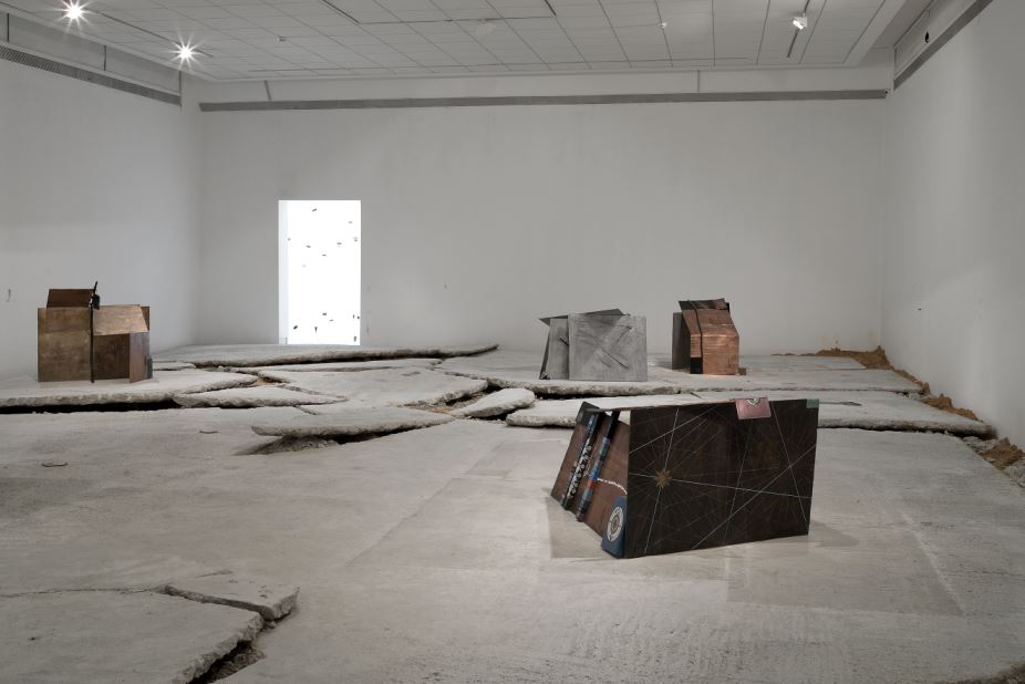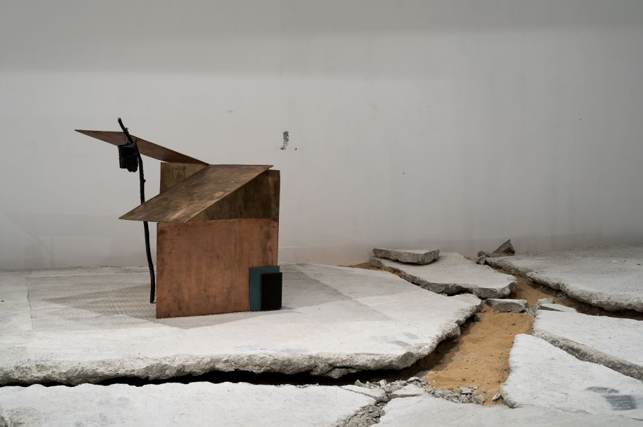 החלל הראשון מאוכלס בסדרה של אובייקטים פיסוליים, כעין מבני מחסה ארעיים, העשויים יציקות ברונזה, אלומיניום ונחושת, שנוצקו על בסיס לוחות קרטון משומשים. לצדם מוצגים יומנים ישנים, אובייקטים וחומרים נוספים. טרובה פועלת על גבי עבודות הפיסול היצוקות, מטביעה בהן סימנים, נוסחאות ומפות שונות, חלקן מפות ניווט ארציות וחלקן מפות שמימיות – אלמנטים המתייחסים למגוון זמנים ותרבויות. האובייקטים השונים פזורים בחלל שהקרקע בו בקועה, ספק בשל חלוף הזמן, ספק בשל אירוע אפוקליפטי כזה או אחר.