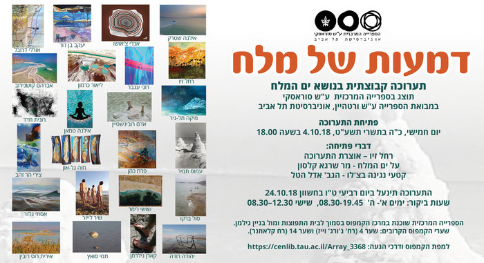 דמעות של מלח / הספרייה המרכזית , אוניברסיטת תל אביב04/10/2018 עד ה-24/10/2018 דמעות של מלח 4.10.18 – 24.10.18 אוצרת התערוכה : רחל זיו ייחודו ויופיו של ים המלח, המהווה משאב טבע עולמי ולאומי, הם נקודת המוצא לתערוכת האמנות "דמעות של מלח", שמטרתה להציג ולעורר מודעות ציבורית למצבו העגום והמתייבש של ים המלח, היקר לכולנו. ים המלח הוא סיפור עצוב, המקום הייחודי שלנו, שזכה להיכלל כאחד מפלאי עולם מבחינת הנוף, האקלים והחיים שבו. הגיע הזמן לעשות פעולות לתיקון המצב ולדרוש שהחלטות לאומיות להצלת ים המוות יקוימו, כדי שהדורות הבאים יכירו גם הם ים מלא חיים, כפי שאנו הכרנו. בתערוכת "דמעות של מלח", מציגים אמנים מתחומי יצירה שונים: בציור, בצילום, במעשה טלאים ועוד... בדרכם האישית מבטאים הם את מחשבותיהם והלכי רוחם על הקורה בים המלח כמו: יצירות אמנות בצבעוניות פסימית ותחושות לתקווה, ציור מופשט המתאר שבריריות וחוסר יציבות, קשר עמוק אל הטבע ואל מה שמעבר לו, צילומים המתארים את ים המלח כמקום של שקט מתעתע מעל, בעוד שמתחת הקרקע מאיימת לבלוע את מה שמעליה. יש ביטויים ותחושות של חנק ותיסכול על הרס אחד מפלאי הטבע, על הניצול הכלכלי שייהפך לאתר תעשייתי במקום אתר תיירותי. עיבוד שגורם לאיבוד. "אני רואה חשיבות רבה בקיום התערוכה. כאמנית וכתושבת ערד לשעבר, ים המלח היה חלק מהוויית חיי, והנושא קרוב ביותר ללבי. ההפקה ואוצרות התערוכה מהוות עבורי יצירה אמנותית". מיקום - הספרייה המרכזית , אוניברסיטת תל אביב הספרייה המרכזית שוכנת במרכז הקמפוס בסמוך לבית התפוצות ומול בניין גילמן. שערי הקמפוס הקרובים: שער 4 (רח' ג'ורג' וייז) ושער 14 (רח קלאוזנר). זמנים - 04/10/2018 עד ה-24/10/2018 פתיחת התערוכה - 04/10/2018, שעה - 18:00 |