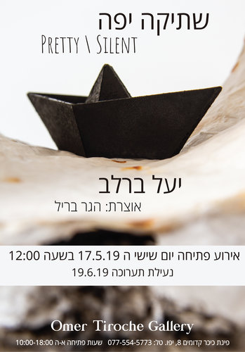 שתיקה יפה / גלריה עומר תירוש17/05/2019 עד ה-19/06/2019 גלריה עומר תירוש גאה להציג את שתיקה יפה, תערוכת היחידה של האמנית יעל ברלב. התערוכה, באוצרותה של הגר בריל, מורכבת ממספר גופי עבודות, אשר נוצרו והותאמו במיוחד עבור חלל הגלריה, ואשר נפרשים אל מול הצופה עם המעבר בין החדרים השונים.