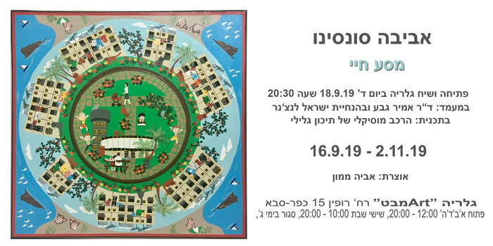 מסע חיי / גלריה 'ארטמבט'18/09/2019 עד ה-02/11/2019 אביבה סונסינו היגרה עם משפחתה מפולין לארץ ב-1957 ומספרת בציוריה את מסע חייה. זיכרונותיה המצוירים הראשונים, הם מביתה בפולין ושם מתחיל מסעה. בהשראת התרבות הפולנית המקומית מעטרת אביבה חלק ממסגרות הציורים שלה בדימויי תחרה בסגנון פולני. בעבודות האחרות ובהמשך למסעה באניית עולים ולקליטתה בארץ, מספרת האמנית את סיפור המדינה שלנו עם ציוני דרך מרכזיים, אתרים שרובנו מכירים, המתובלים בחן הראוי לשבח, וציורים מבית ילדותה בשכונת רמת יוסף בבת ים בה גדלה ובגרה. סיפורה האישי כילדה שרוב חייה עברו בבת ים, וילדותה השמחה והמאושרת באים לידי ביטוי ו"מצוטטים" בחלק גדול של הציורים. בין המראות המתארים את סיפור המדינה שלנו, ניתן לראות את ככר דיזנגוף ומזרקת אגם ששכנה בה, ככר הבימה בתל אביב, שכונת רמת יוסף שבבת ים, נהלל, ועוד ועוד. ציוריה מקפיאים לרגע מראות של מקומות מרכזיים ומאפשרים לנו להיזכר גם באלו שכבר אינם. ציוריה ססגוניים, צבעוניים מאד, מלאי שמחת חיים ומצוירים בסגנון הייחודי רק לה. האופי נאיבי עם טוויסט מקורי משלה. האמנית ממשיכה ומצירת על המסגרות סביב הציור, ובהן מצויים האלמנטים הרלוונטיים לנושא המצויר. המשך הציור על המסגרת, תורם ומעשיר את הנושא אותו בחרה לצייר. חלק ניכר מהציורים הינו בסגנון מעגלי כמופיע בציור הילדים המחזיקים ידיים או במעגלי הבתים המצוירים, וחלקם האחר מצויר בסגנון פרונטאלי. אין ההחלטה אם יהיה הציור פרונטאלי או בצורה מעגלית משפיעה על אופי הציור, והוא עדיין משדר נאיביות, תמימות ואושר. אביה ממון – אוצרת מיקום - גלריה 'ארטמבט' רחוב רופין 15 כפר סבא