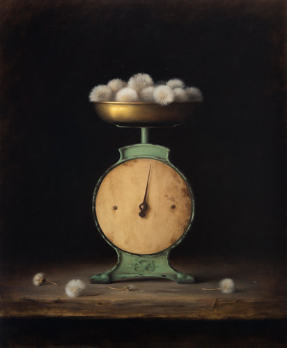 דנה זלצמן / מונו נו אווארה / גלריה זימאקטלפון - 972 3 6915060 19/09/2019 עד ה-25/10/2019 דנה זלצמן / מונו נו אווארה Dana Zaltzman / Mono No Aware אוצר - ירון הרמתי טקסט: ד?ר דיויד גרייבס ככלל, יצירת אמנות משקפת את התרבות בה היא נוצרה. אחד הדברים המרתקים ביותר בעיון בציורים הוא לנסות לראות השתקפות ערכית זו, לנסות לעמוד על האופן שהציור המסוים נותן מבע לצורת חיים מסויימת. זה כמו לפצח חידה, כמו לפענח צופן. ואכן, החידה צפונה בציוריה של דנה זלצמן. "לשקול נוצות?" פלוני עשוי לשאול בתמיהה. "לבנים גסות על כר לבן צחור?" על פניו, דנה ממשיכה מסורת ציורית עשירה של המערב בכך שהיא מציירת טבע-דומם. ציירים רבים כיום מגלים ענין מחודש בטבע-דומם. אולם, בשונה מציורי הטבע-דומם של המאסטרים ההולנדים במאה ה 17, אשר נטו לצייר חפצים יקרי-ערך ואקזוטיים, אמנים רבים כיום נוטים לצייר חפצים יומיומיים לא מרשימים במיוחד – כיכר לחם, צנצנת חמוצים, קופסאת סרדינים... ציירי היומיום הללו, ואולי בהשפעת אמנים כאנטוניו לופז גרסיה הספרדי או ישראל הרשברג אצלנו, מתרכזים ב'כאן ועכשיו', ומנסים להתרחק ממשמעויות "עמוקות" יותר הצפונות בשפה הציורית שלהם. לא כך דנה. בעבור דנה, החפץ הפשוט ביותר – משקל, תיבת דאר, קן של ציפור, לבנה – הוא שער לממלכה עשירה ומורכבת של רעיונות, אפשרויות וסנטימנטים. עושה רושם שדנה מוקסמת מן האמת הפשוטה של חפצי יום-יום. לכל חפץ שכזה יש סיפור, סיפור חיים, אם תרצו, ודנה מבקשת להראותו. אולם, הקונץ פה (אם יורשה לי) זה שאמנם החפץ פשוט, אבל הסיפור לא. בעצם, הסיפור כל-כך לא-פשוט שאי-אפשר סתם לספר אותו, צריך להראות אותו. וכך דנה מציבה את החפץ ואת סיפורו בזרקאור של הכיארוסקורו המסורתי. האור-צל המסורתי אינו רק בחזקת "התכתבות" עם הציור הבארוקי, הוא משחק תפקיד חשוב בציור של דנה. האור חושף, החושך מערטל, והאחד אינו קיים ללא השני. יש דברים בסיפור חייה של לבנה או של תיבת דואר שהם גלויים, וישנם דברים שהם נסתרים. אור וחושך, גלוי ונסתר, תשובות ושאלות, והם כולם כרוכים זה בזו. ואולי זה סוג של יחסי "יין-יאנג" כאלו? ואכן, אחד המפתחות לפענוח הצופן הציורי של דנה בא מתרבות אחרת לגמרי מן התרבות הישראלית, או אפילו המערבית. מדובר בתרבות יפן, ובכמה מושגי יסוד באסתטיקה היפנית. המושג האחד הוא "וואבי" (Wabi). וואבי מתיחס ליופי שבפגם, ליופי שאינו מושלם. באסתטיקה היפנית, חפץ יפה יראה לא גמור, לא מושלם, אפילו לא שלם. הוא מראה את פגמיו, מראה שהוא עדיין בתהליך של התהוות, עדיין במצב לא סופי של היות. זו תפיסה מנוגדת לתפיסת היופי הקלאסי במערב. במערב, אידיאת היופי הינו מושלם, נצחי. במערב, יצירת האמנות הקלאסית שואפת לאמת מוחלטת, בלתי-משתנה ועל-זמנית. במזרח נהפוך-הוא: הקלאסיקה היפנית שואפת להראות עולם בהתהוות מתמדת, דינמית, נוצרת ומתכלה ללא הרף. שורשי מושג הוואבי בבודהיזם הסיני העתיק, ושורשים אלו נטועים בתפיסת עולם שבו הכל חולף, ארעי, ושאין דבר קבוע, מושלם או אפילו גמור. כאשר כל הדברים בטבע, וכל החפצים שאנו מייצרים, כולם מתקיימים זמנית בנהר הזורם של המציאות, הרי גורלו של חפץ – חדלונו – ידוע מראש ומגולם בתוך החפץ מלכתחילה. לגישה זו קוראים 'מונו נו אווארה' ('הפאתוס של הדברים' , mono no aware) בפי היפנים. הוא מורה על הלך רוח מיוחד במינו של רגישות אמפתית לבר-חלוף, מן המוצק ביותר ועד לאוורירי ביותר, ממשקולת הברזל ועד לנוצת הפוך. ב ללא כותרת (2019), אנו ניצבים בפני פחית זהובה שרוטה ודפוקה, עם מכסה חצי סגור (חצי פתוח?). מה יש בפחית זו? כנראה משהו חשוב, שכן רואים שעשו בה שימוש רב. אפילו המדבקה ירדה. אבל, חשוב ככל שיהיה תוכן הפחית, זה כנראה נגמר. המכסה הפתוח נראה כבר פתוח לצמיתות, ומורה על כך שימי הזוהר של פחית זו חלפו. יחד עם זאת, הפחית עדיין זוהרת. מבעד לשריטות ולדפיקות, הפחית מקרינה אור זהוב, ומאירה את סביבותיה העגמומיים. המושג השני החשוב לפענוח ציוריה של דנה הוא "סאבי" (Sabi). סאבי מתייחס ליופי אשר נגלה על פניהם של הדברים אשר מראים את ג