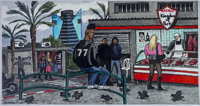רעיונות על נייר / גלריה רוזנפלדטלפון - 972-3-5229044 17/12/2020 עד ה-21/01/2021 שמה של התערוכה מעיד על תוכנה - רעיונות ונושאים המעסיקים את זויה צ'רקסקי בעשור האחרון, אותם היא משרבטת, רושמת ומציירת על ניירות. חלקם משמשים כסקיצות או כרישומי הכנה לעבודות גדולות על בד וחלקם ציורים על נייר העומדים בפני עצמם. זויה עוסקת דרך קבע בכמה נושאים במקביל. היא לומדת אותם ואוספת חומרים ויזואליים, עד שאלו מתגבשים לכדי ציור שלם. לעיתים היא חוזרת אל רעיונות שהעסיקו אותה בעבר, אשר הבשילו עם חלוף הזמן. התערוכה הנוכחית מבקשת להאיר זרקור על "מאחורי הקלעים" של העבודות ולחשוף מעט מתהליך העשייה, והיא כוללת עבודות בשלבים שונים של הכנה, בהן נראים לעיתים תיקונים, מחיקות ושינויים בקומפוזיציה. העבר הסובייטי מוסיף להיות נושא מרכזי ביצירתה, אך באופן שונה מכפי שהוא מיוצג בפרויקט 'ילדות סובייטית' מ 2018. שם חזרה זויה בעיקר לזיכרונותיה הפרטיים, ואילו העבודות החדשות עוסקות בזיכרון הקולקטיבי - בילוי ופנאי, ספורט, סרטים וגיבורי תרבות. בשתי עבודות, למשל, מצוירים המהגרים האיטלקים ניקולה סאקו (Sacco) וברטולומאו ואנצטי (Vanzetti), שהואשמו ברצח כפול והוצאו להורג במסצ'וסט בשנת 1927. פרשה זו הכתה גלים והשפיעה על התודעה הציבורית בברית המועצות לשעבר, בעיקר בשל הסברה כי המשפט נגדם הוטה ממניעים אנטי-קומוניסטים. בציור אחר, נוטלת זויה לעצמה חירות היסטורית, ומושיבה לשעת תה מוזיקלית את צמד המהפכניות הסוציאליסטיות קלרה צטקין (Zetkin) ורוזה לוקסמבורג (Luxemburg), שהיו בשעתן מודל להערצה עבור מיליוני אזרחים סובייטים. בסדרת ציורים נוספת מתארת זויה מראות שהם חלק משגרת יומה ומן הסביבה הסמוכה לביתה ברמת-גן, ולסטודיו שלה בדרום תל-אביב. דיירי נווה שאנן ושכונת שפירא - הקבועים והמזדמנים - נרקומנים, זונות, מהגרי-עבודה ופליטים. רחוב ביאליק המיתולוגי עם הקיוסקים וחנויות ההלבשה התחתונה, ומנגד שכונות חרדיות בבני-ברק. אורחות החיים של הקהילה החרדית, הרחוקים שנות אור מסגנון חייה שלה, מסקרנים ומרתקים אותה. הזרות והריחוק המנטלי עומדים כניגוד לשכנות ולקרבה הפיזית. הגבול בין בני-ברק לרמת-גן עמד בעת האחרונה במרכז סערה ציבורית סביב משבר הקורונה והחשש של תושבי רמת-גן מפני "פלישת" החרדים לשטחם. בתערוכה מוצגות גם סדרות הדפסים חדשות, העשויות בטכניקה של תצריב על מתכת. העבודות נוצרו בסדנת ההדפס בקיבוץ כברי, במהלך השנה האחרונה. טכניקת התצריב, בה מתנסה זויה לראשונה, הפכה לחלק משמעותי ביצירתה. תהליך העבודה המורכב מצריך תכנון וביצוע מדויקים, כמו גם ראייה גרפית, יד יציבה וקו ברור ובוטח. בשנה החולפת איירה זויה שני ספרי ילדים. 'אדון שמחה וששון' - הוא ספרה השני המשותף עם גליה עוז, כלת פרס ראש הממשלה לספרות. ספרן הראשון - 'מתי כבר החתול שלנו יאהב אותנו?' זכה בעיטור "הפנקס" ליצירה מצטיינת, ובשבחי הביקורת על הטקסט הנפלא והציורים המקוריים והמרהיבים. גיבורת הספר השני 'טלי מתחת לשולחן' מאת תמר וויס-גבאי, היא ילדה נבונה ומרדנית המכריזה על עצמה "אני קיפודה" ומסרבת לצאת מתחת לשולחן האוכל המשפחתי. אי-אפשר שלא להבחין בדמיון בין דמותה של טלי השובבה לבין בתה בת החמש של זויה. הציורים המקוריים מתוך ספרי הילדים מוצגים ב"רוזי", חלל הפרויקטים של הגלריה. מיקום - גלריה רוזנפלד זמנים - 17/12/2020 עד ה-21/01/2021 |