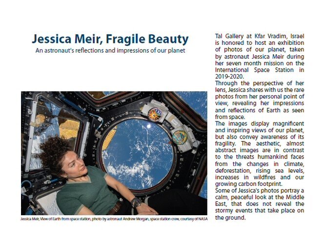 ג'סיקה מאיר, יופי שביר, רשמיה והרהוריה של אסטרונאוטית על הפלנטה / גלריה טלטלפון - 04-9573933 0547542699 20/02/2021 עד ה-30/06/2021 בהתבוננות דרך עדשת המצלמה, בתפיסה פרספקטיבית ומעוררת מחשבה על כדור הארץ, צילומיה מציגים מראות יופיו של הכדור, אך גם את השבריריות, לצד האסטטיקה כמעט אבסטרקטית מוצגים האיומים והסכנות העורבים לאנושות מההרס עקב שינויי האקלים, דלול היערות, עליית גובה פני הים, ושרפות הענק.